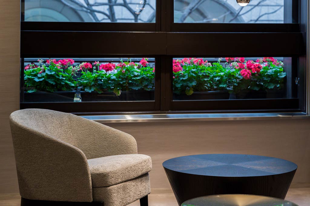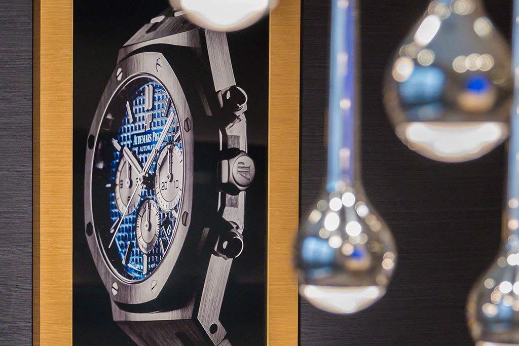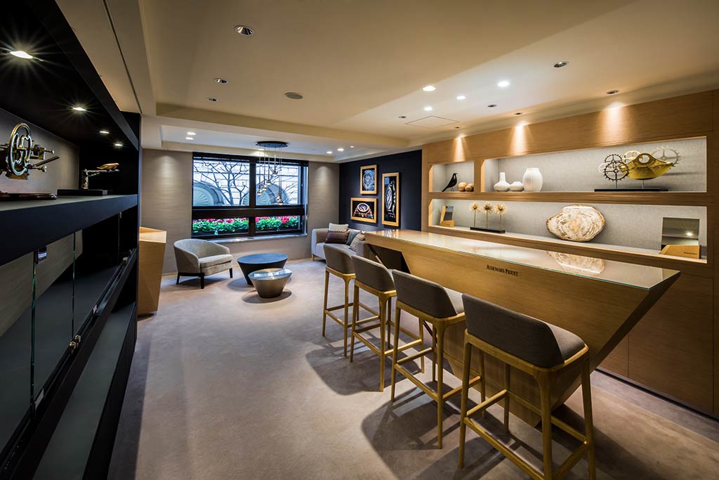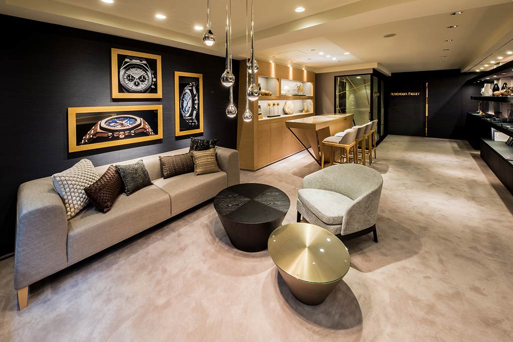 洗練された天然の建材や什器でデザインされたサロンはオーデマ ピゲの故郷で複雑時計発祥の地であるスイス・ジュウ渓谷の自然をイメージさせる温かみのある空間。