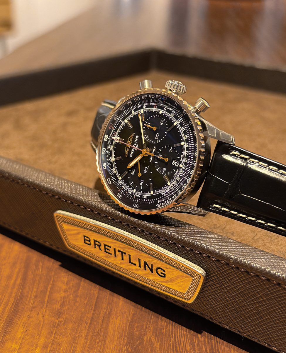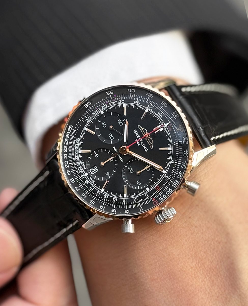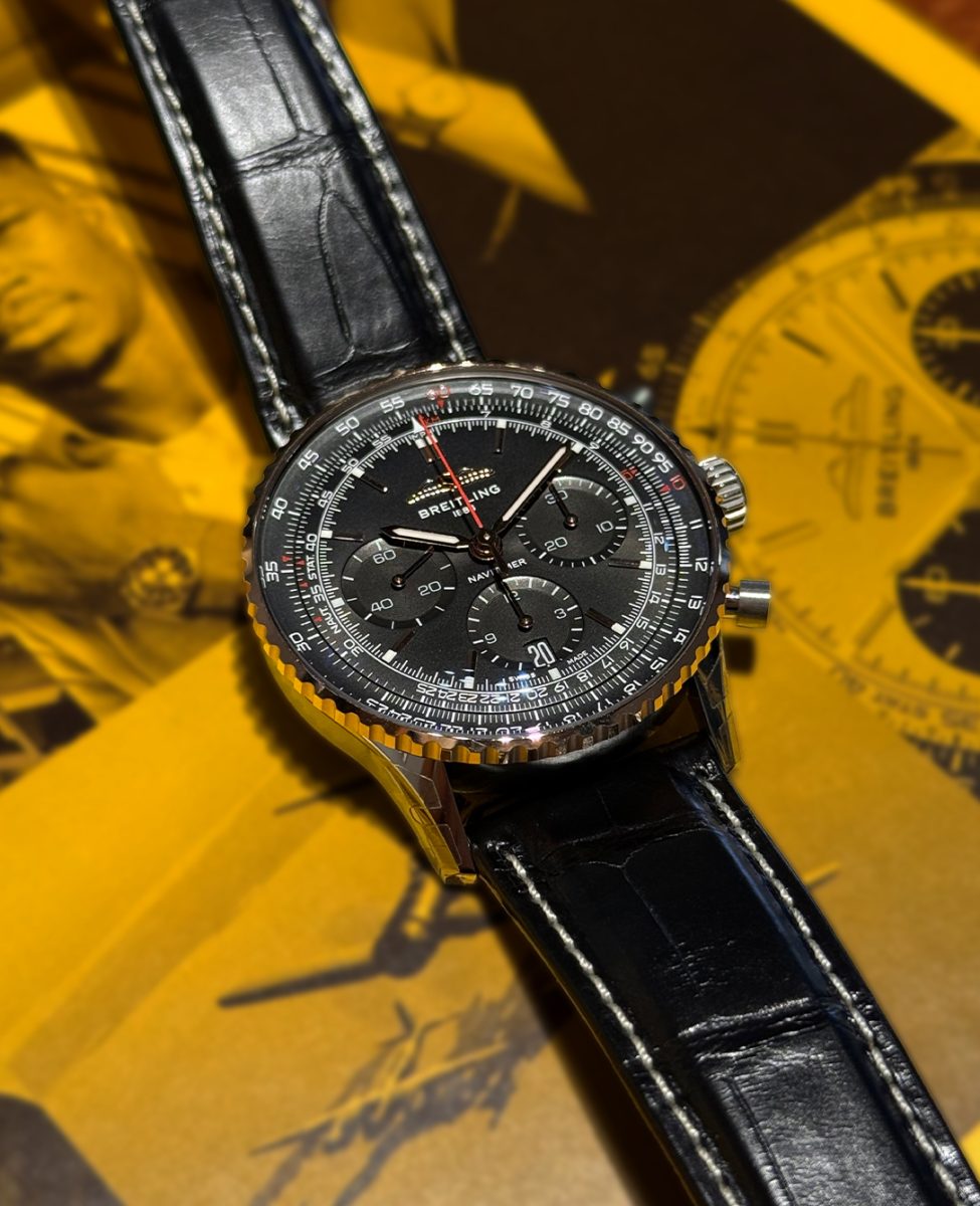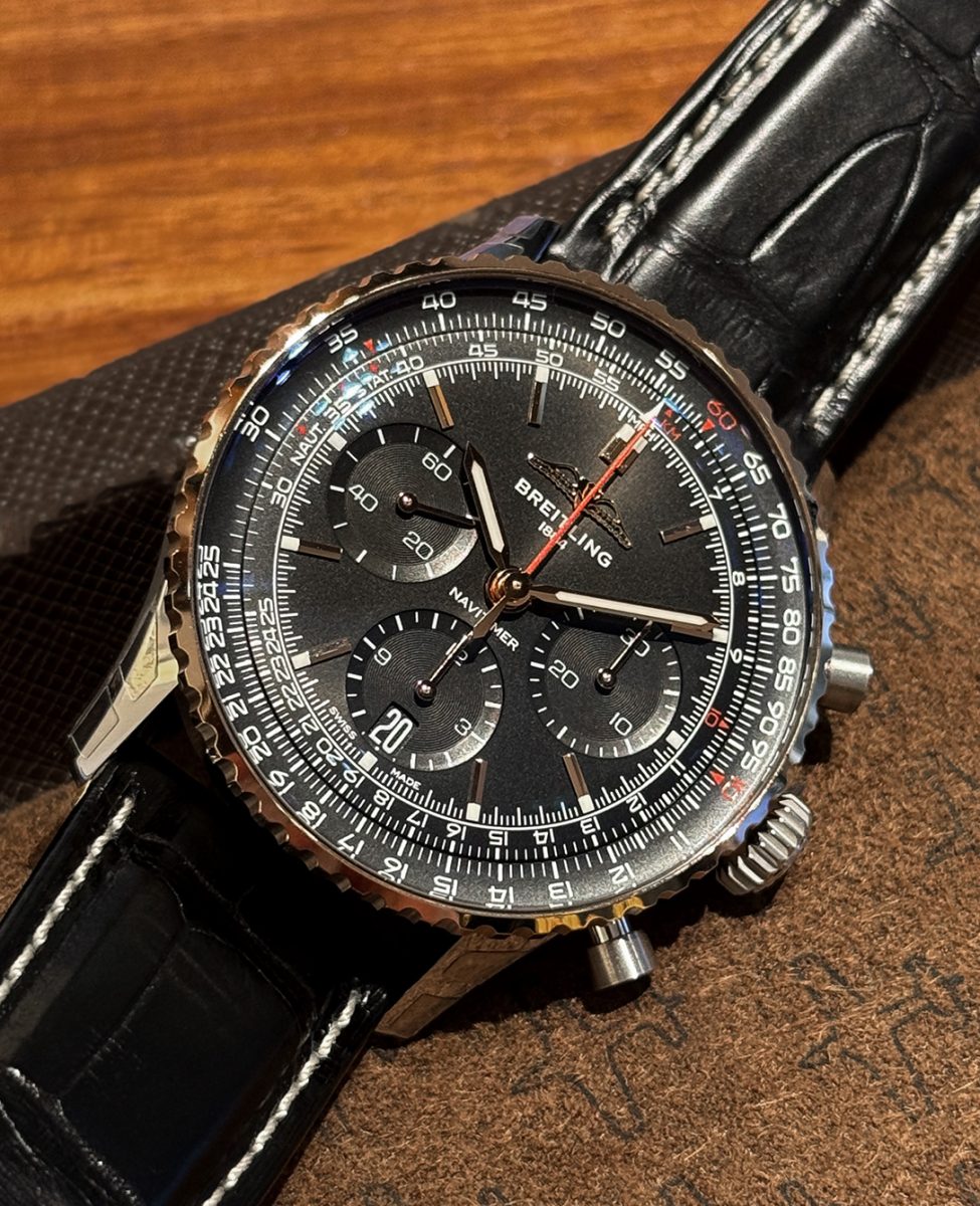 今回ご紹介するナビタイマーの特徴は、文字盤・インダイアル・文字盤外周の平らな回転計算尺のすべてがブラックカラーで統一されており、文字盤をワントーンにまとめたことで、ナビタイマーのスタイルを維持しつつ、シックな印象になりました。