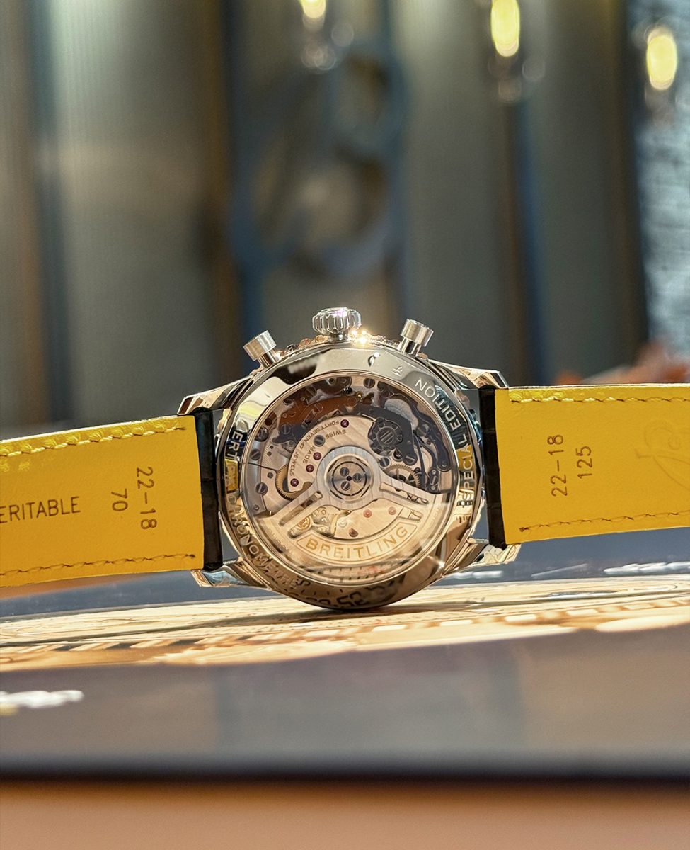 搭載するムーブメントは、COSC認定クロノメーターのCal.01。シースルーバックからは、ローターやクロノグラフの制御機構など、この高性能なムーブメントを観賞することができます。