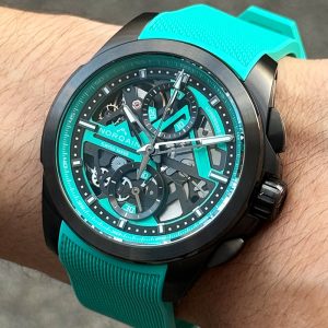 搭載するムーブメントは、COSC認定クロノメーターのCal.01。シースルーバックからは、ローターやクロノグラフの制御機構など、この高性能なムーブメントを観賞することができます。