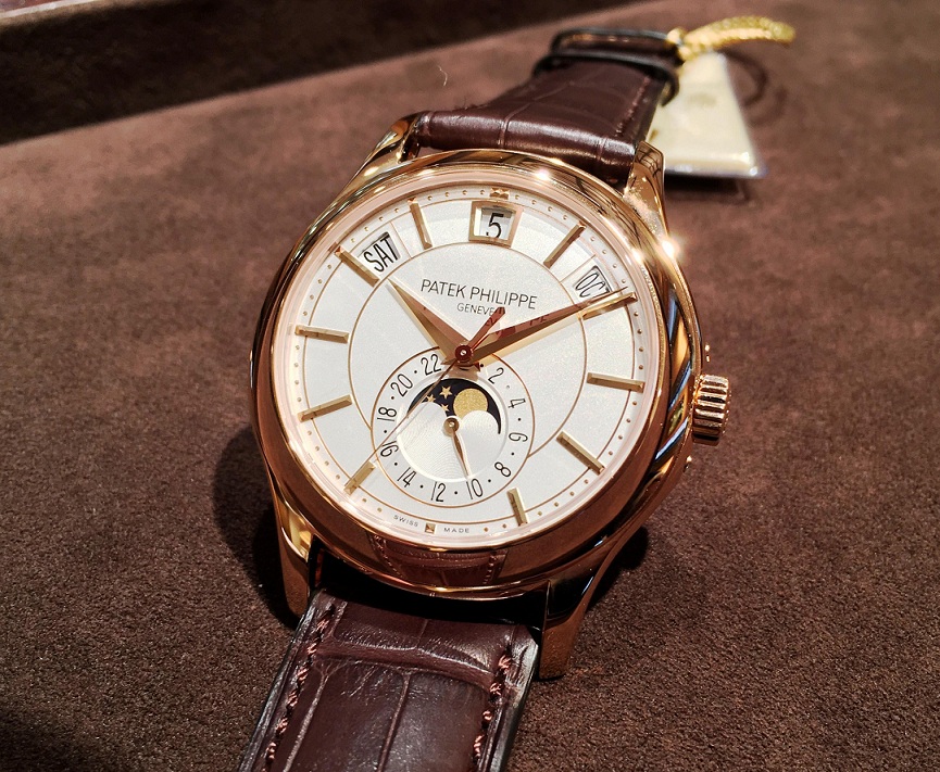6時位置のムーンフェイズの月も、ローズゴールドのケースの色に合わせた色です。