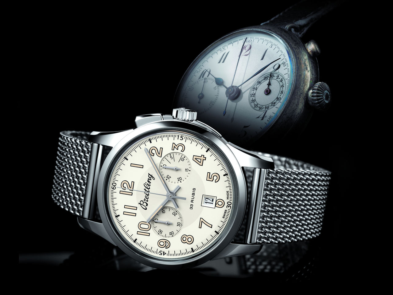 1915年にブライトリングが独立した専用プッシュボタン機構を備えた腕時計クロノグラフを発表。