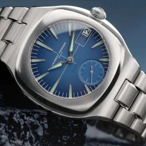 文字盤には本物のレザーが使われており、艶感と深みがある黒色に特徴的なアラビア数字とバーインデックスでデザインされたインパクトあるモデルです。