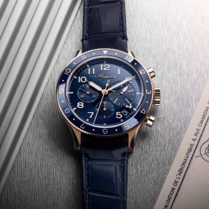 第二時間帯の情報が不要になったら、リューズと一体化したローズゴールドのプッシュボタンを押すと、瞬時に針が重なります。この重なり方が非常にスムーズでいいんです!複雑機構でありながら、複雑に見せない所がメゾンの精神を受け継いでいます。