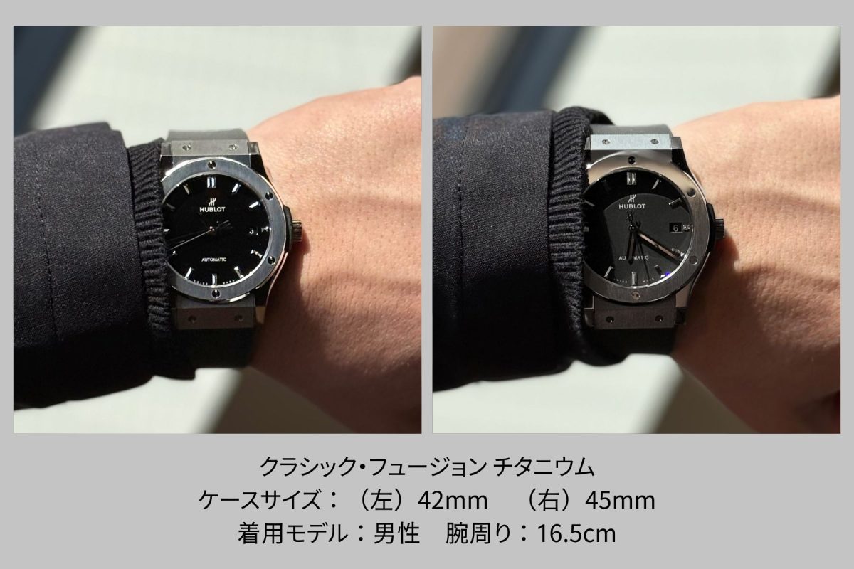 クラシック・フュージョンの異なるケースサイズ(33mm、38mm、42mm、45mm)の着用写真を参考にして頂きながら、ぜひ一度実機を手に取ってご試着をお勧めいたします。