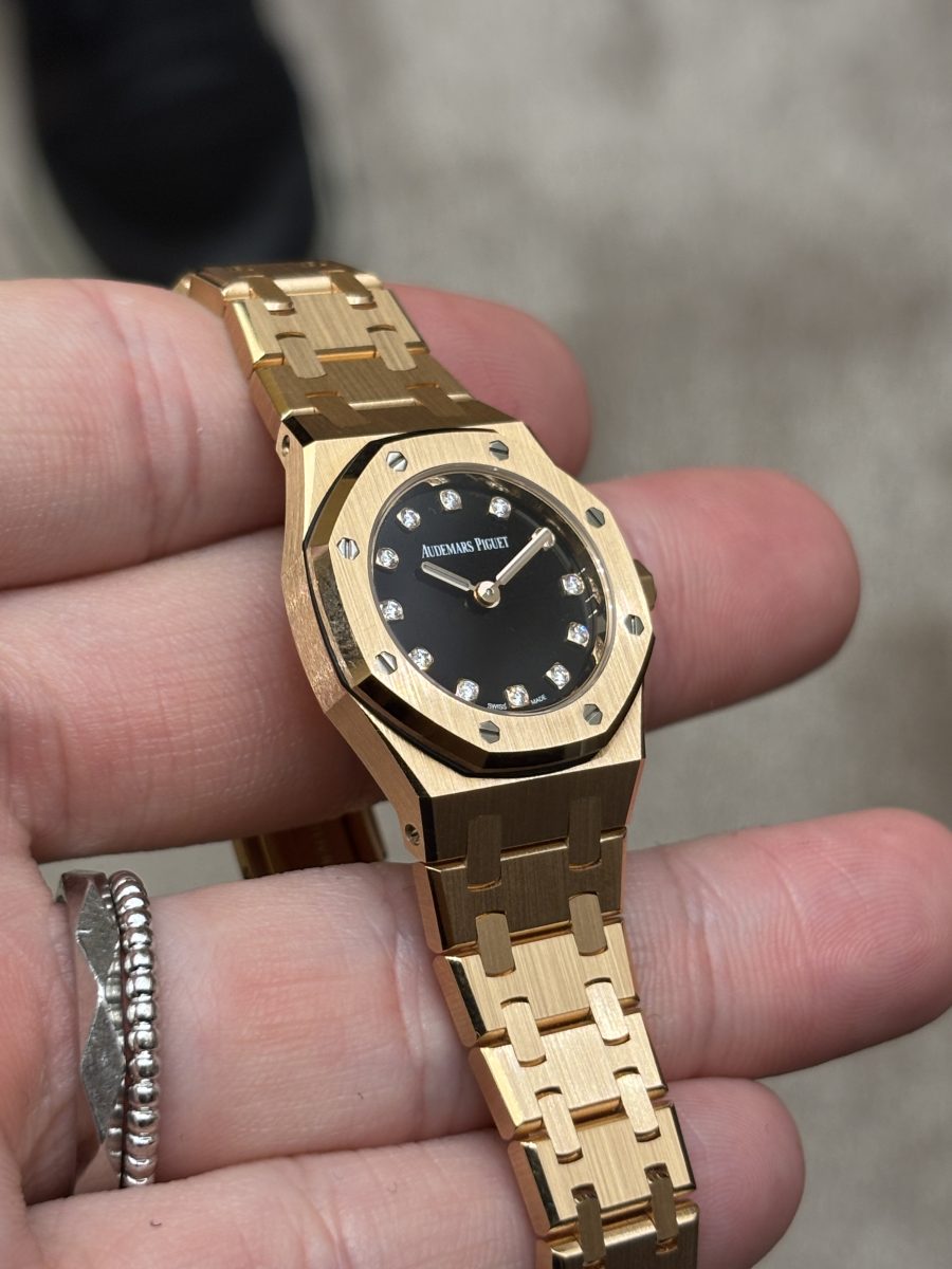 わずか23mmのケースに、ロイヤル オークの象徴的なデザインを凝縮した「ロイヤル オーク ミニ」。ピンクゴールドの華やかな輝きとブラックオニキスとブリリアントカットダイヤモンドで構成されたダイヤルは、まるでジュエリーのような繊細さを演出します。
