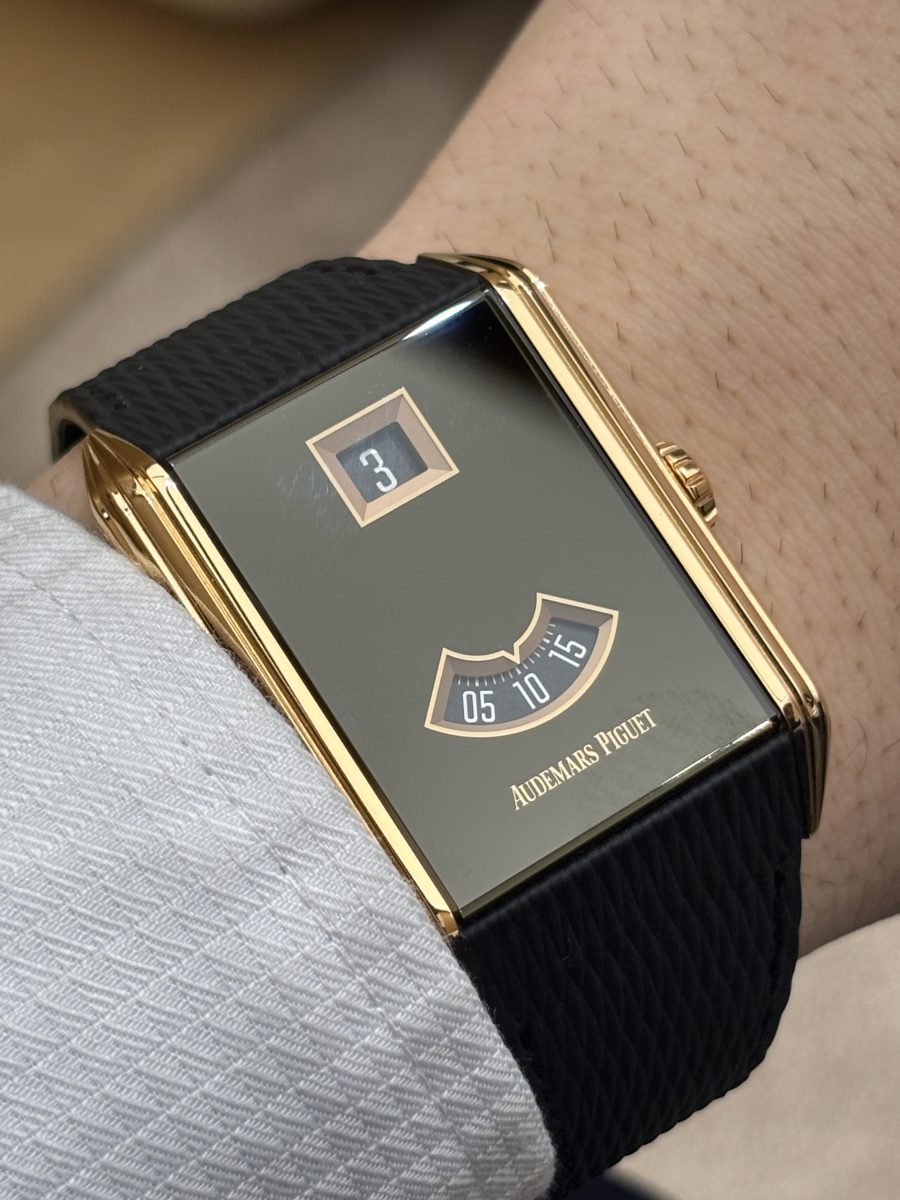 幾何学的な美しさと現代的な解釈を融合させた新作「ネオ フレーム ジャンピングアワー」。ピンクゴールドの暖かみのあるケースが、構造的な文字盤のデザインを際立たせます。APの飽くなき挑戦心を感じさせるこのモデルは、時計を「時間を見る道具」から「腕に纏うアート」へと昇華させています。