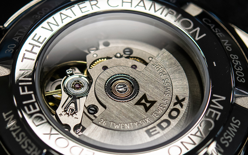 デルフィンメカノには、優秀で信頼度の高いスイス製自動巻きキャリバー「EDOX853」を搭載しています。ダイアル側だけでなくケースバックもスケルトン仕様なので、ムーブメントの動きを裏側からも楽しめます。