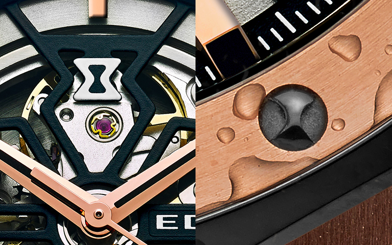 デルフィンはエドックスの防水時計の原点ともいえるコレクションです。1961年に世界初の特許機構「ダブル・Oリング」を発明し、ねじ込み不要で200m防水性能を実現させました。デルフィン メカノもスケルトンダイアル・シースルーケースバックながら200m防水と高い防水性能を誇ります。