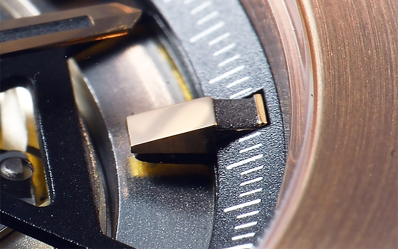 立体感のあるスケルトンダイアルは、テンプ・ガンギ車・アンクル・香箱・日の裏車といった時計の主要部が見られるアートワーク設計です。通常見られない歯車の力の伝達をダイアルから眺められます。また、ベゼル部分含めダイアルデザインは、どこから眺めても美しく見えるようシンメトリーに設計されています。