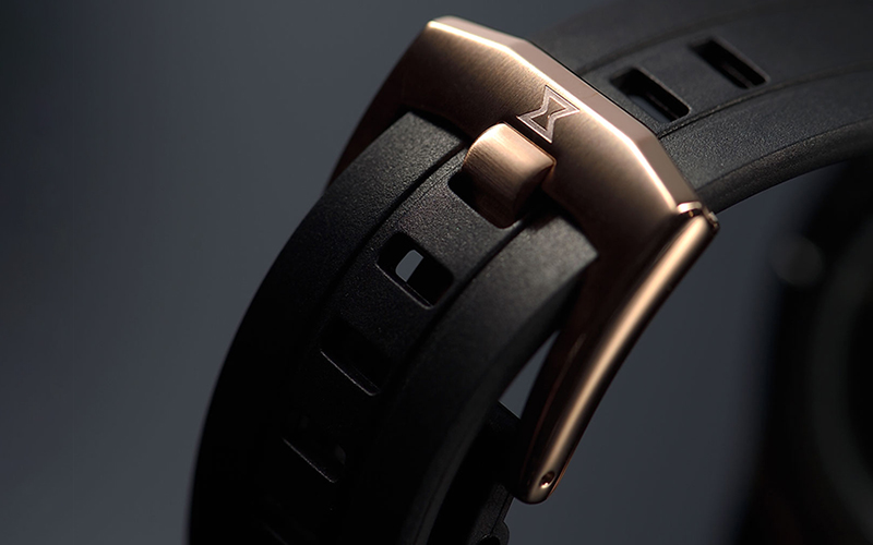 シリコンを配合して作られたラバー素材のストラップは、柔らかく腕馴染みが良いのが特徴です。水に強く耐久性にも優れています。尾錠側のベルトをカットできる仕様となっている為、手首が細い方も適切なサイズに調整することができます。