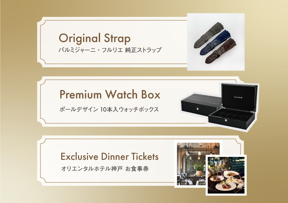9月20日(土)イベントにてパルミジャーニ・フルリエをご成約いただいたお客様には、「パルミジャーニ・フルリエ 純正ストラップ」「ポールデザイン10本入 ウォッチボックス」「オリエンタルホテル神戸 お食事券」の中からお一つお選びいただけます。