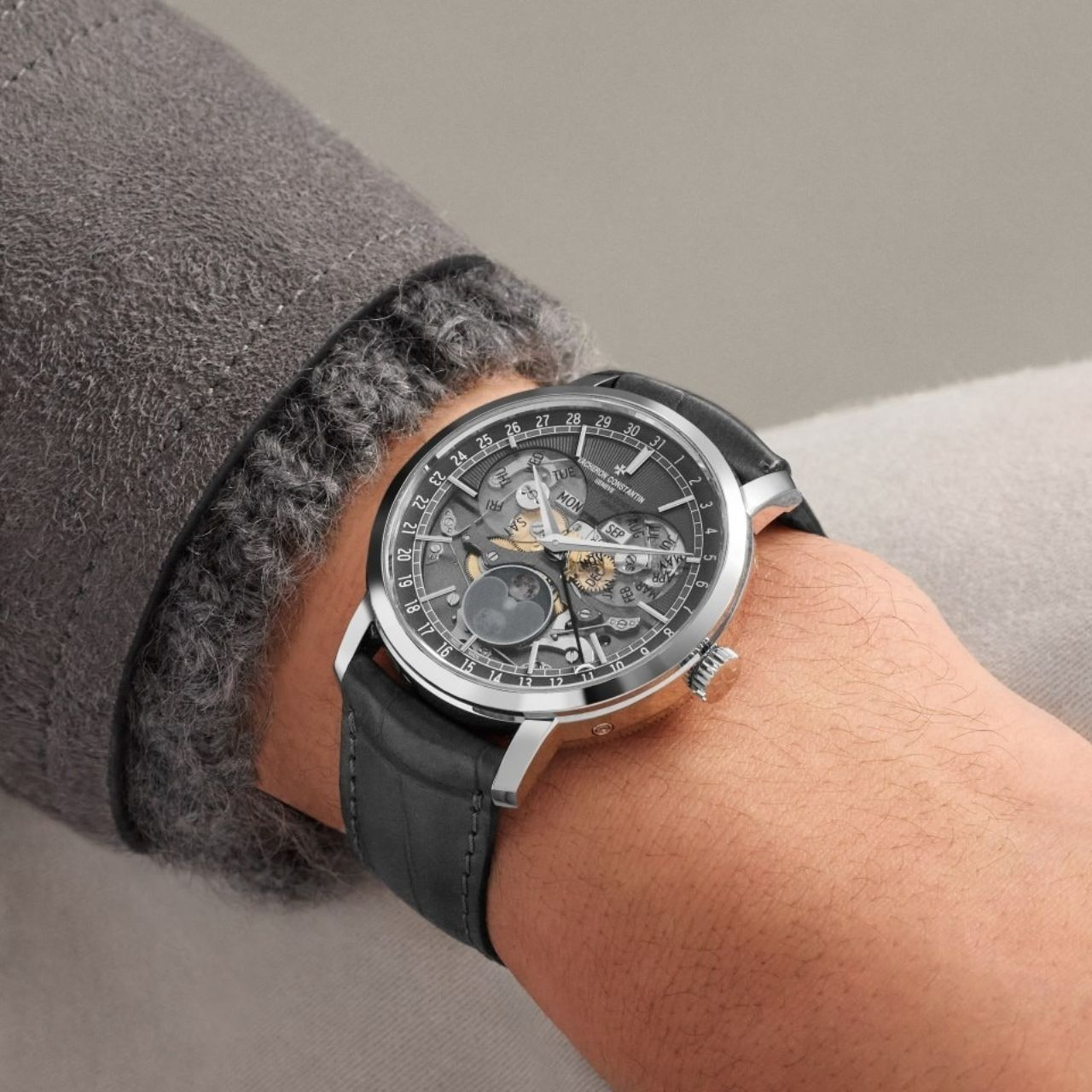 ダイヤル中央には詩情あふれるムーンフェイズ表示が配されており、その精度は驚異的で、わずか122年に一度の調整で済む高性能を誇ります。星の瞬く夜空を思わせるその美しい意匠は、アリゲーターストラップと絶妙に調和し、静謐な世界観を演出します。