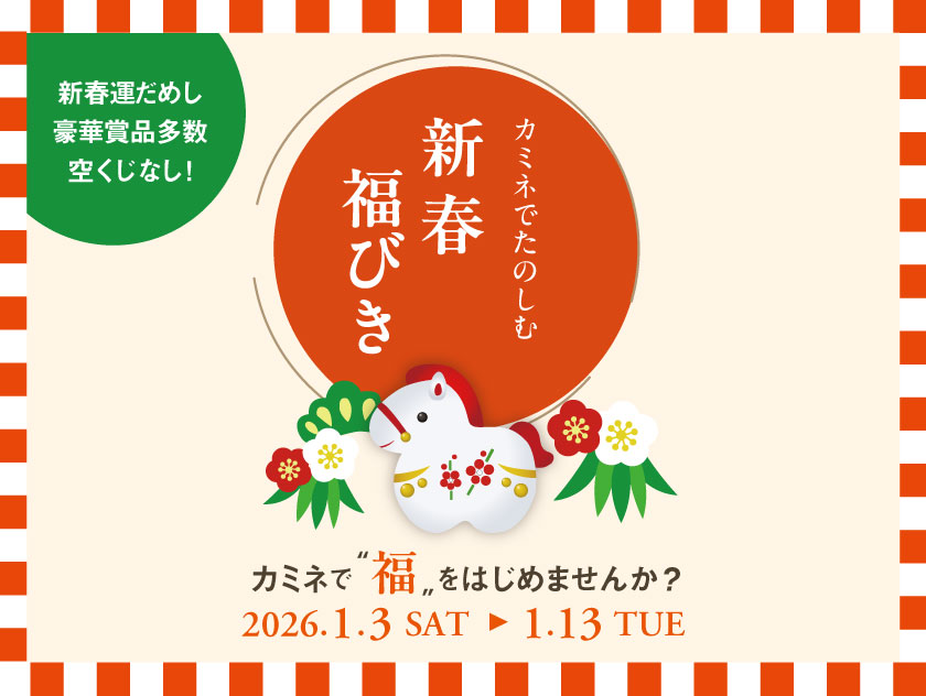 1月3日(土)~1月13日(火)まで 新年を祝うイベント「カミネでたのしむ新春福びき」では、ウォッチ・ジュエリーをお買上げ頂いたお客様に、豪華景品多数・空くじなしのくじ引きにチャレンジしていただきます。新年の運試しに、ぜひ豪華景品を狙ってください!