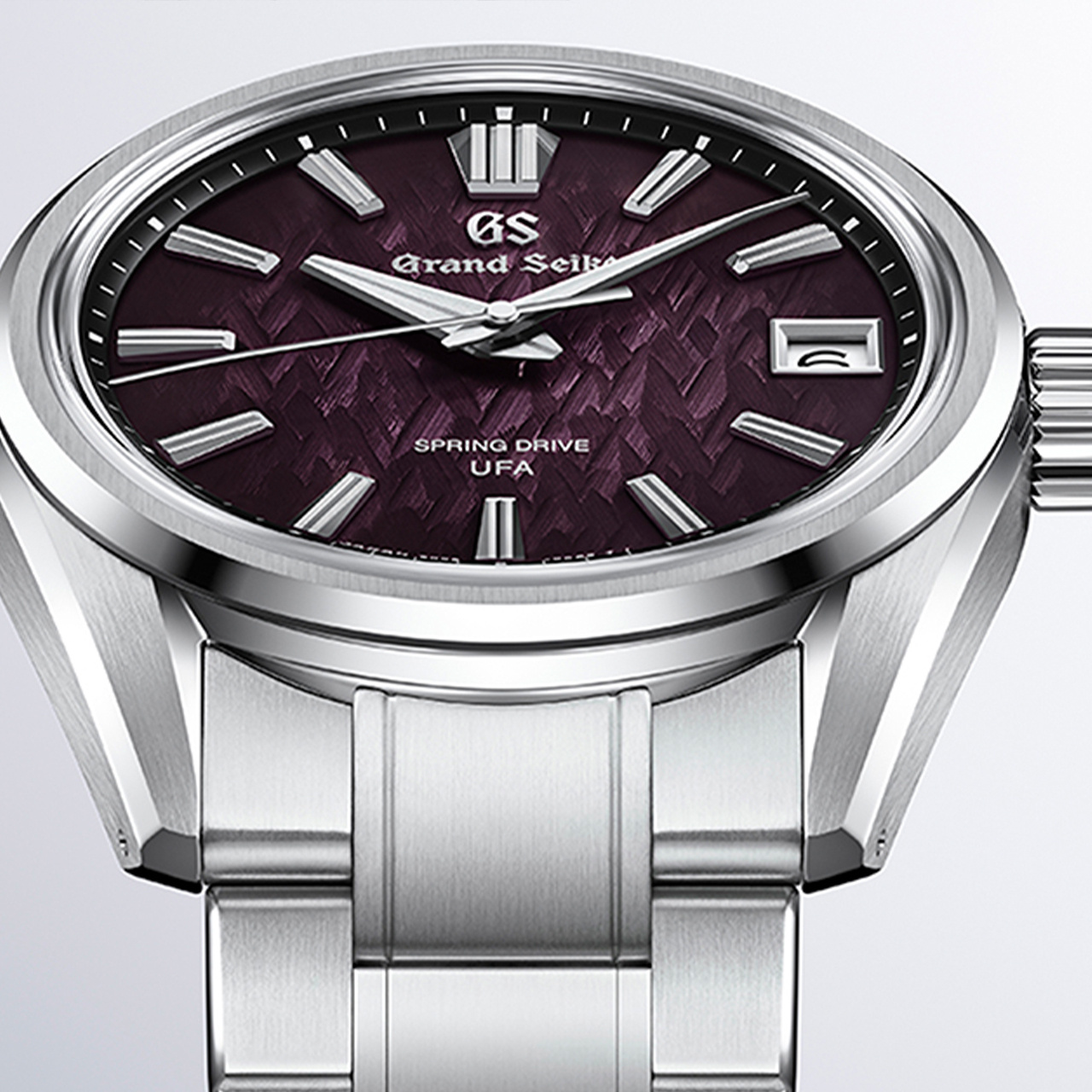 ダイヤルには、スプリングドライブの故郷・信州の冬景色を表現。樹氷の森が静かに夜明けを迎える神秘的な瞬間を、精緻な型打ち模様とバイオレットのグラデーションで映し出しています。