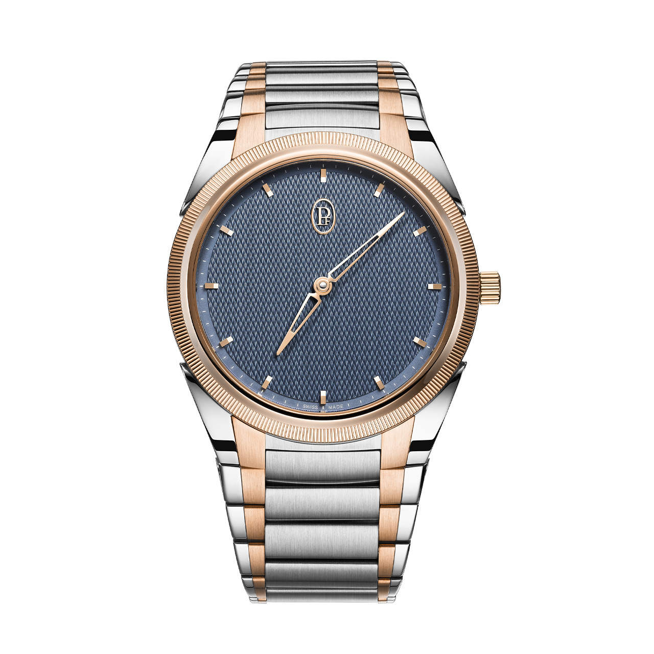 ステンレススティールと18Kローズゴールドのツートンケースに、深みのある「ストーンブルー」ダイヤルを組み合わせたノーデイト仕様は、ミニマルながら力強い存在感を放ちます。インデックスや針のローズゴールド、プラチナ製のディテールと調和し、控えめながら確かな品格を演出します。