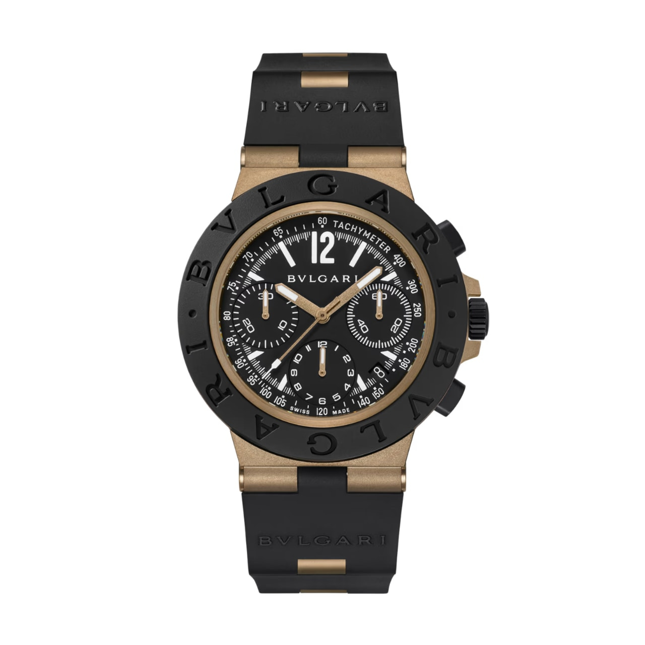 本モデル「ブルガリ ブロンゾ クロノグラフ」は、ブロンズケースならではの経年変化による味わいと、ブラックラバーの現代的な表情を融合した一本。クロノグラフ機能を備えた自動巻きムーブメントを搭載し、約42時間のパワーリザーブを確保するなど、実用性も兼ね備えています。