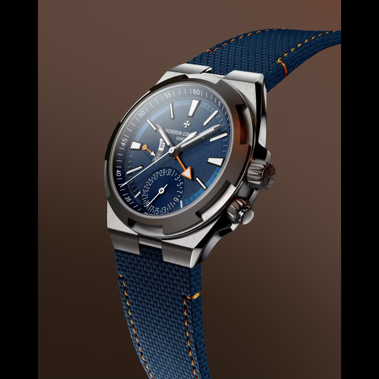 ダイヤルは複数の仕上げを組み合わせた立体的な表情が特徴で、視覚的な奥行きと高級感を演出。オレンジカラーの第2時間帯表示針やAM/PM表示がアクセントとなり、異なるタイムゾーンの視認性を高めています。加えて、6時位置のポインターデイトが実用性をさらに高め、日常における使い勝手にも配慮された設計です。