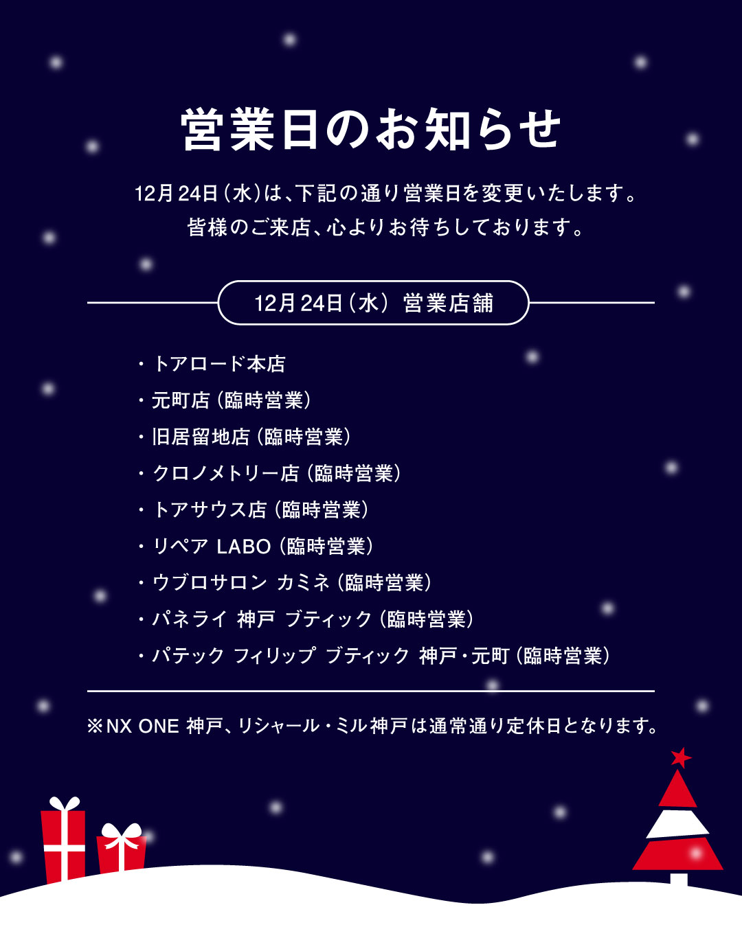 ※NX ONE 神戸、リシャール・ミル神戸は通常通り定休日となります。